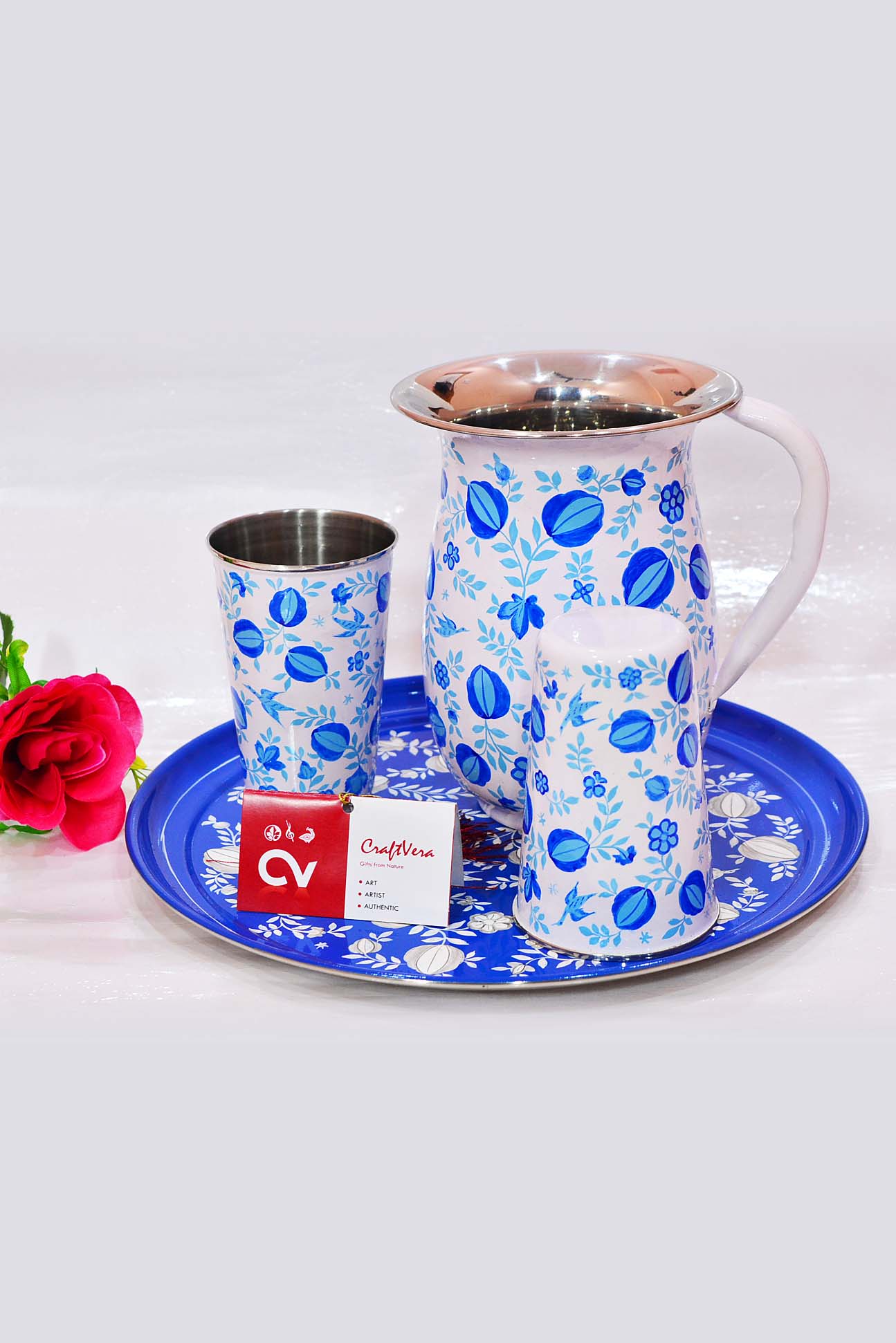 This beautiful traditional bluebell floral design on drinkware set made of high quality stainless steel with hand painted by our talented golden hands, which depict the art of Kashmir. It adds elegance when serving to guests. These can be used for decorative purpose as well .Can be utilized at your Home, Office, Restaurant, Hotel.