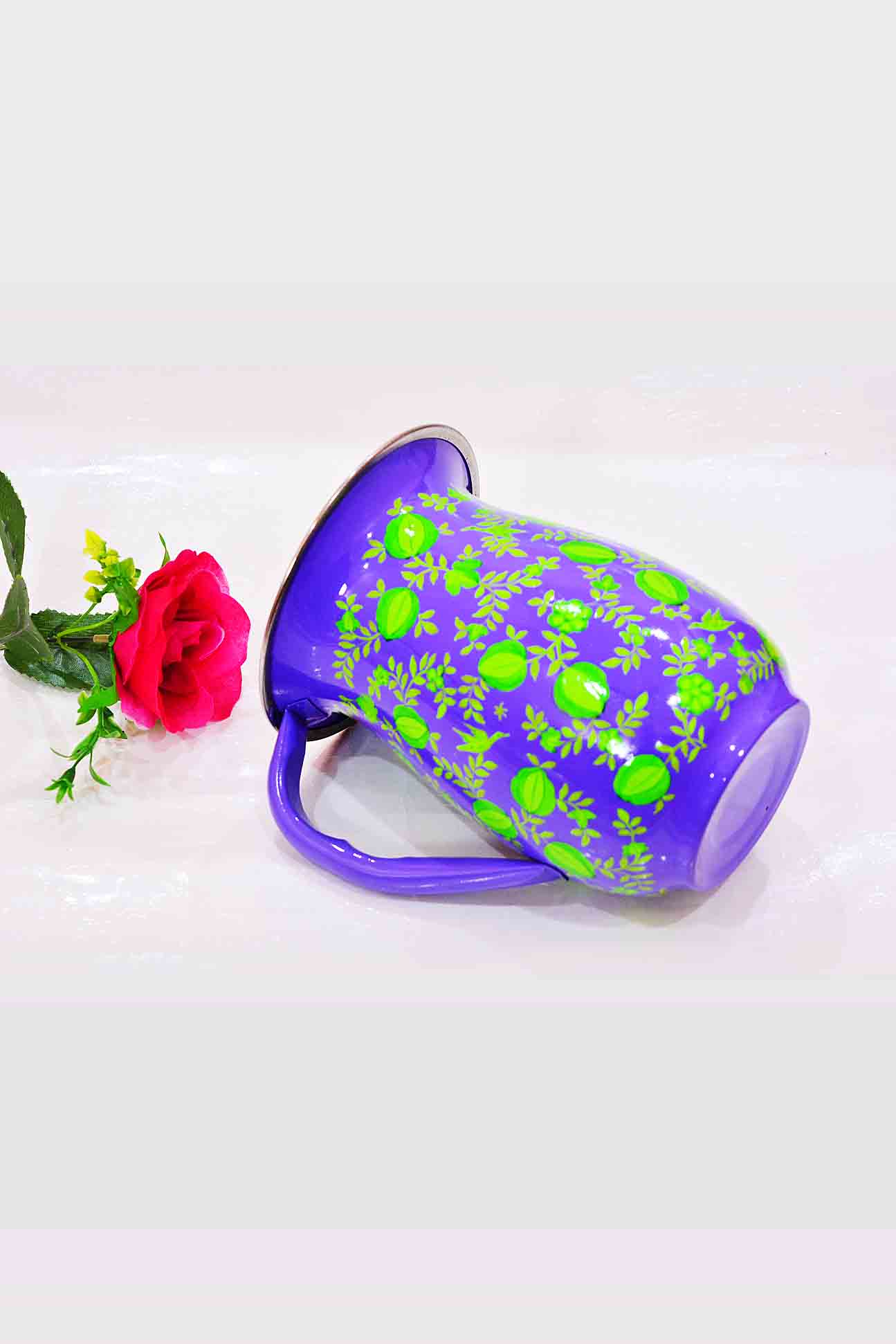 Its a beautiful hand painted floral design on blue stainless steel jug which depicts the art of Kashmir. It adds elegance when serving Juice/drink to guests. These can be used for decorative purpose as well .Can be utilized at your Home, Office, Restaurant, Hotel.